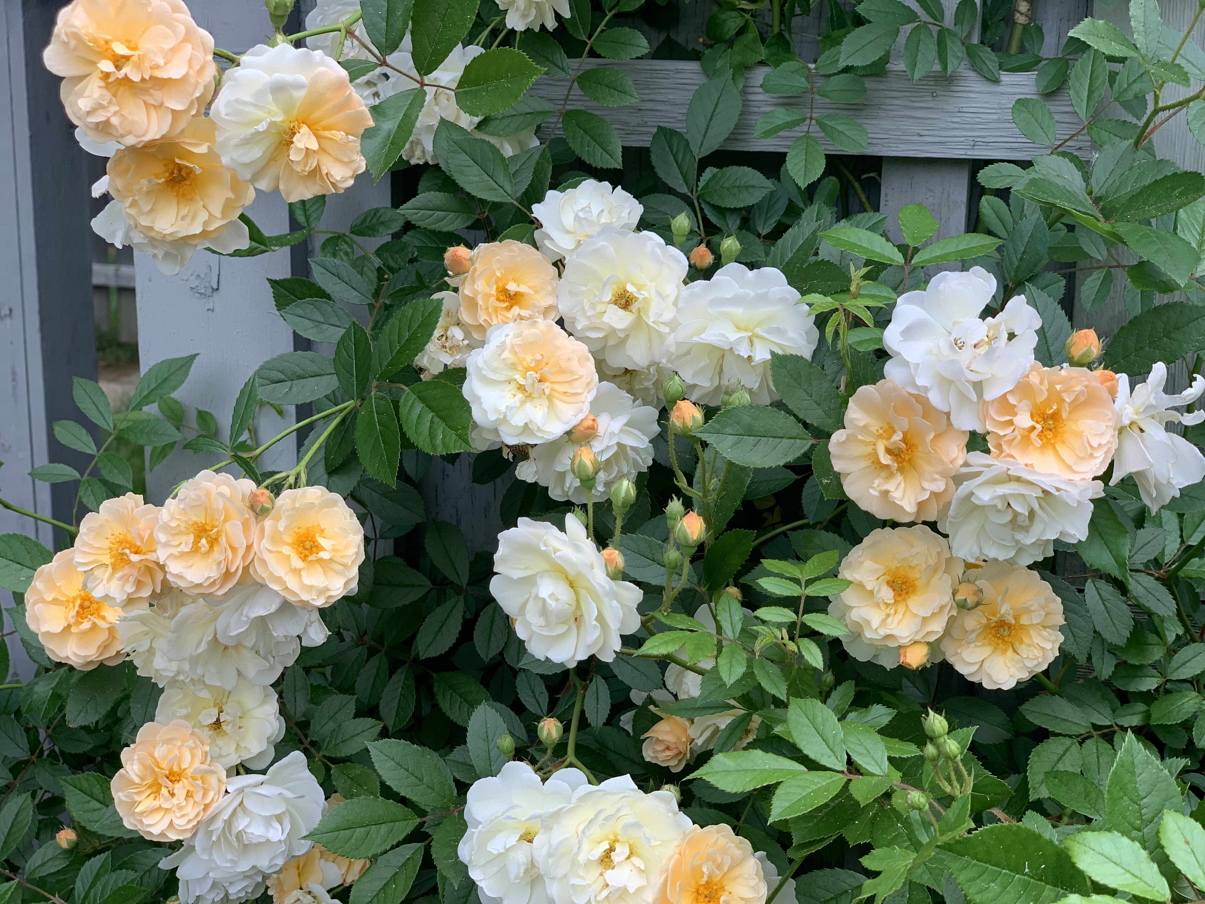 This winter Ghislanie de Feligonde was busy … she threw out several extra-long canes! She is now not only going up the side of the potting shed but across the front too! This week’s wonderful weather was the perfect time to get her all tied up again. I simply CAN NOT WAIT until she blooms.